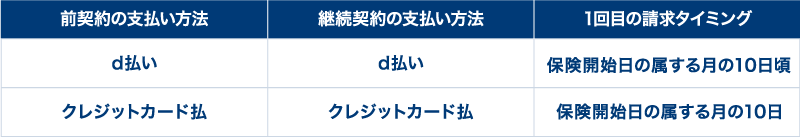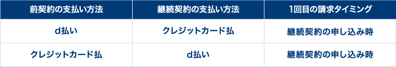 (例)前契約の支払い方法はクレジットカード払、継続契約の支払い方法はd払いの場合